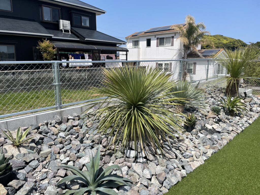 シンボルツリーとしてアガベを据え、砂利やロックを組み合わせるだけで、おしゃれでインパクトのある外観に。