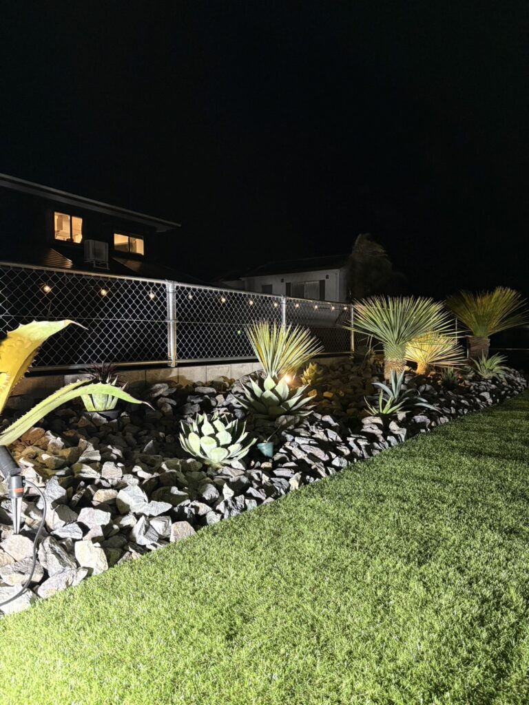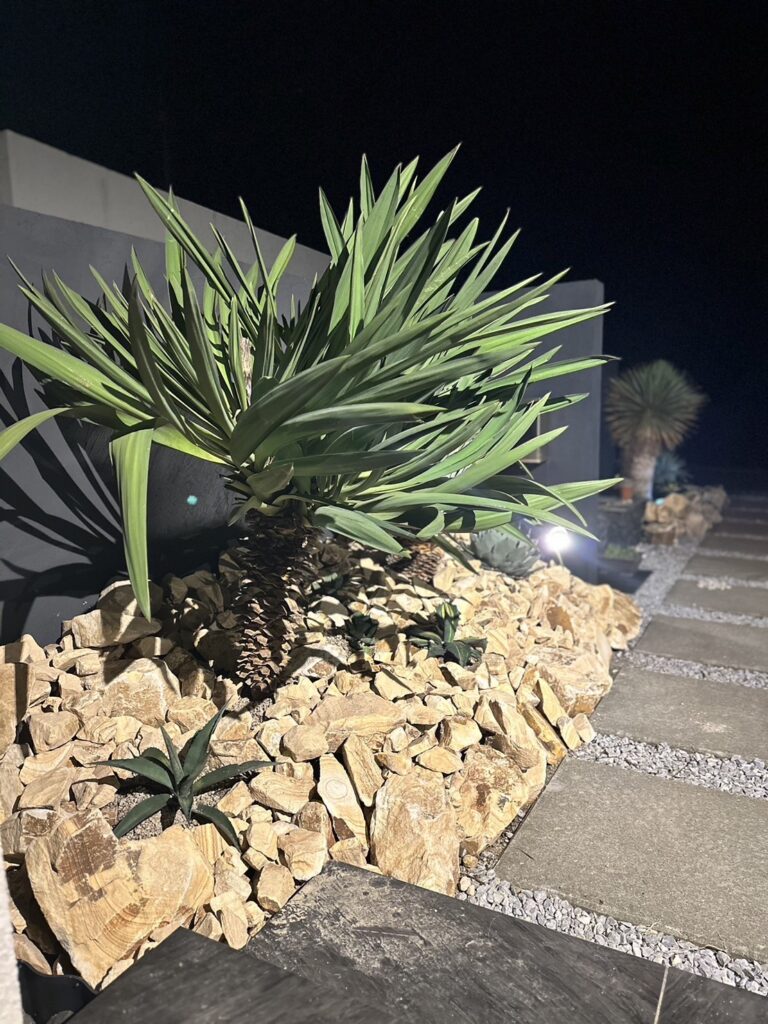 照明効果により、ドライガーデンの独特な植物や石材が美しくライトアップされ、幻想的な空間を演出します。